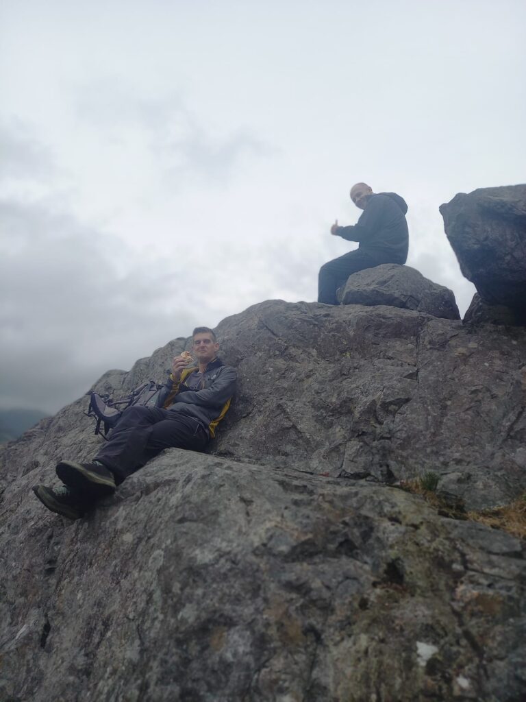 Charley S and Lucy A opted for a V Diff ***, 80m, seven pitch route up the left hand ridge of Pulpit Rock. The climb went well, becoming an upgraded three raindrop rating before Lucy led the sixth pitch after a rain shower had closed in. The warm rock had dried again before Charlie's lead on the final pitch and the pair were not deterred from continuing upwards after climbing to join the melee at the summit of Scafell Pike.