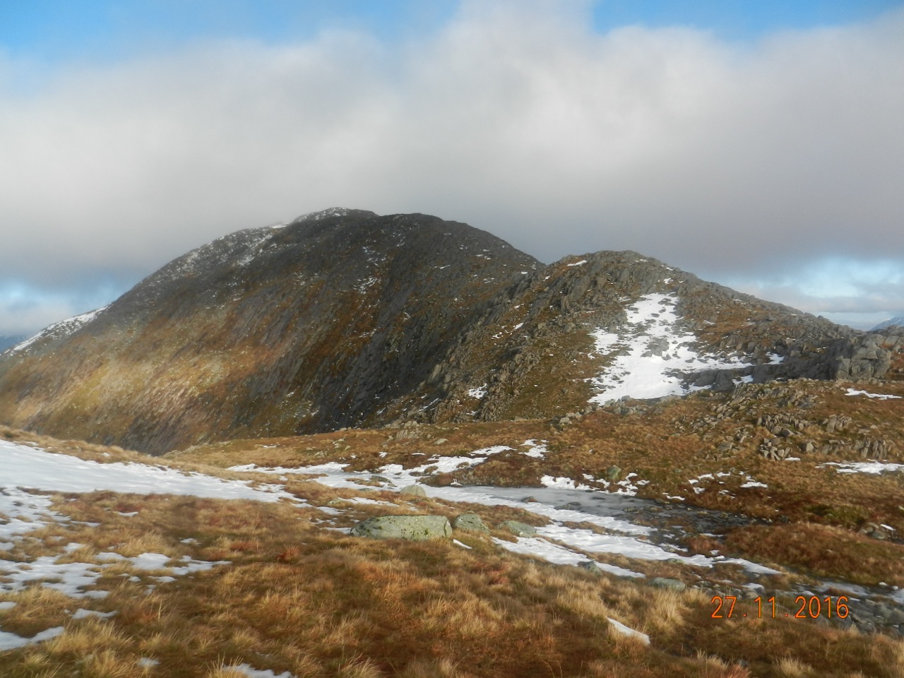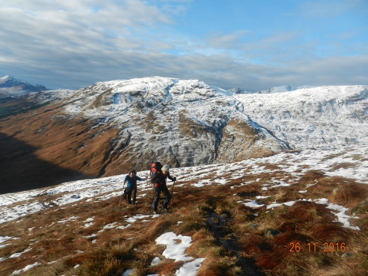 Downwards, we made our weary way in the bright afternoon. Already, the low November sun had cast Loch Creran into a black fjord-like shade, where its waters pointed seawards to Lismore, Ardgour, Mull, and the West. The conversation was mainly about how two relatively lowly west coast hills of 987 and 937 metres could consume so much effort. !!