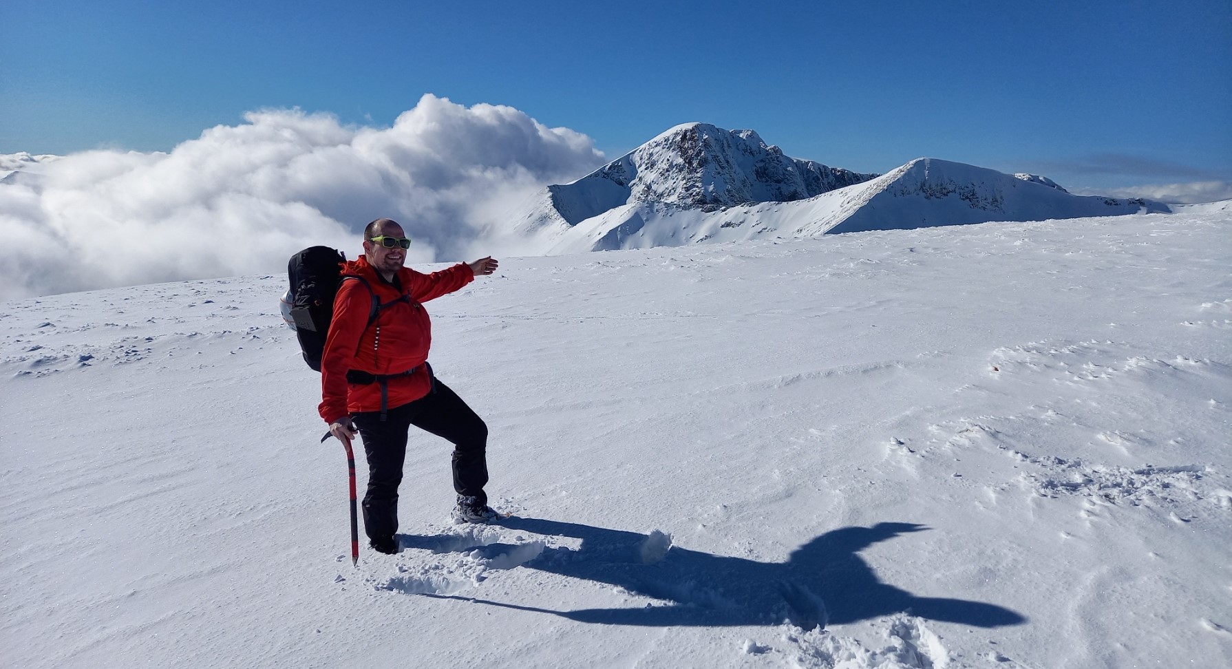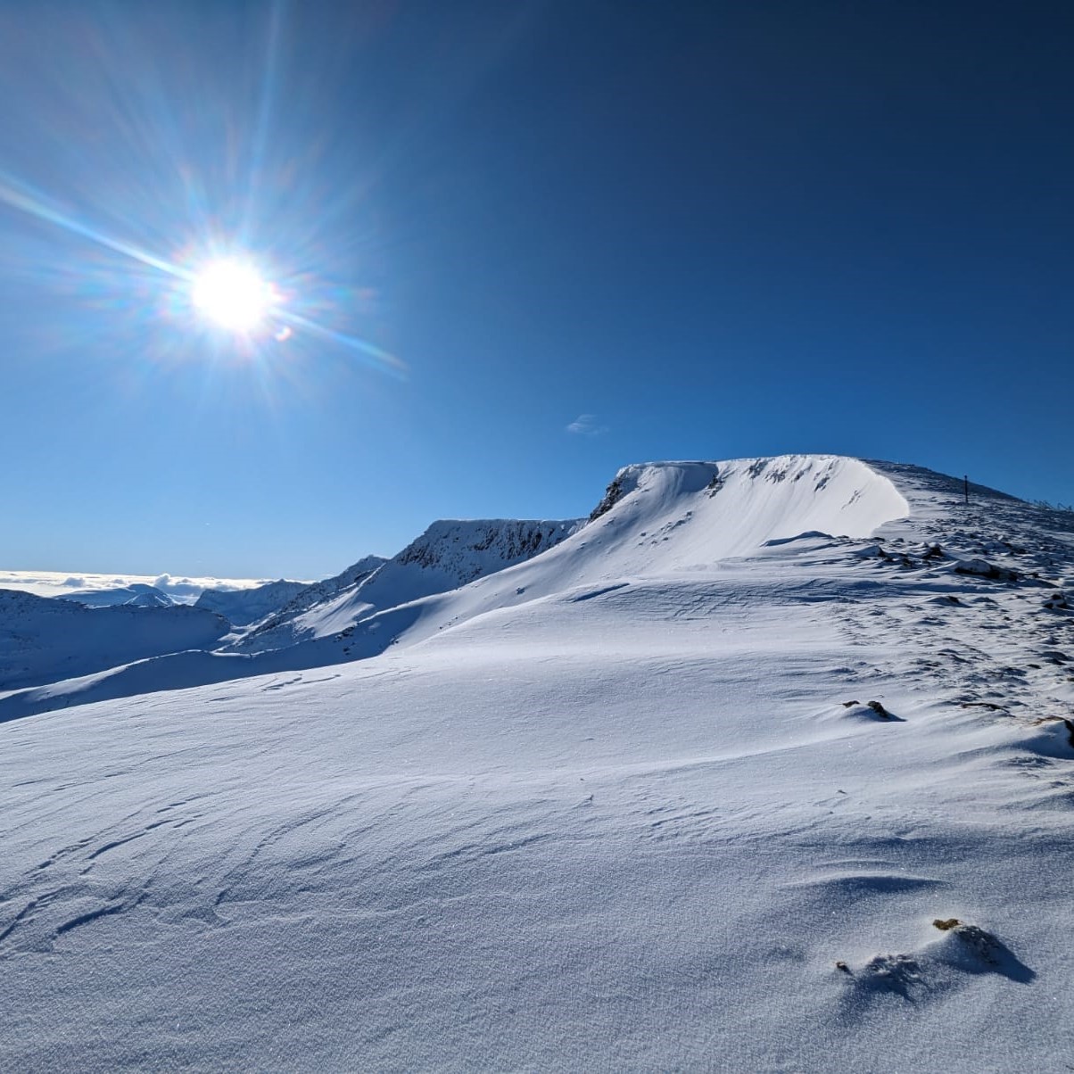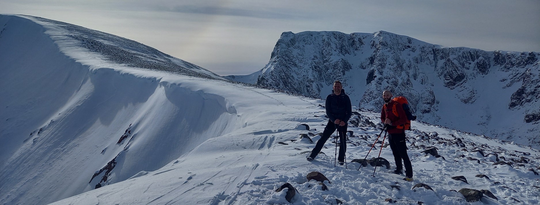 Dave M, Gav H and Martin had decided to tackle the Carn Mor Dearg (CMD) Arete and Ben Nevis. The good and improving ground conditions on neighbouring Aonach Mor had been noted on the previous day and the arete had been tracked. It was a stunning day, the best ever and so few people about. All three had put in another big effort today but were staying for one more night in the hut so after completing the route enjoyed an evening meal at the Clachaig Inn.