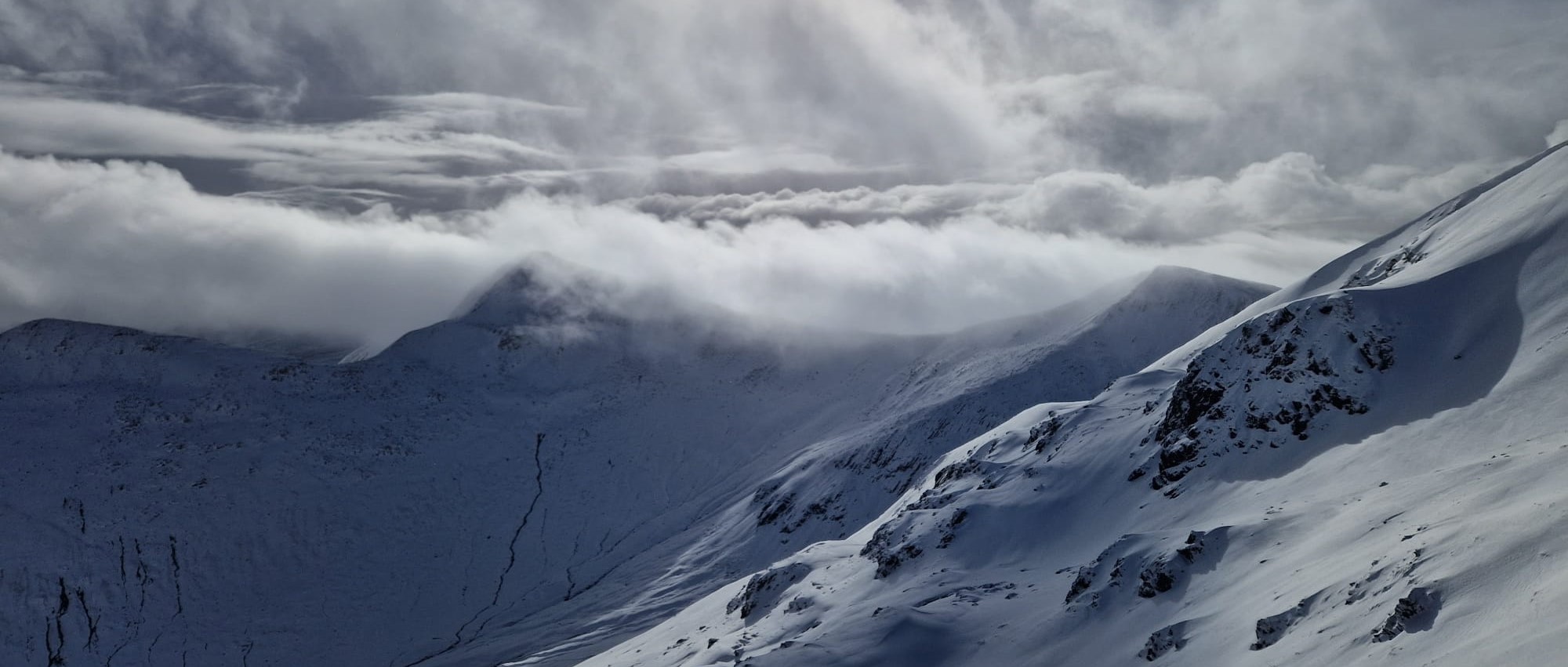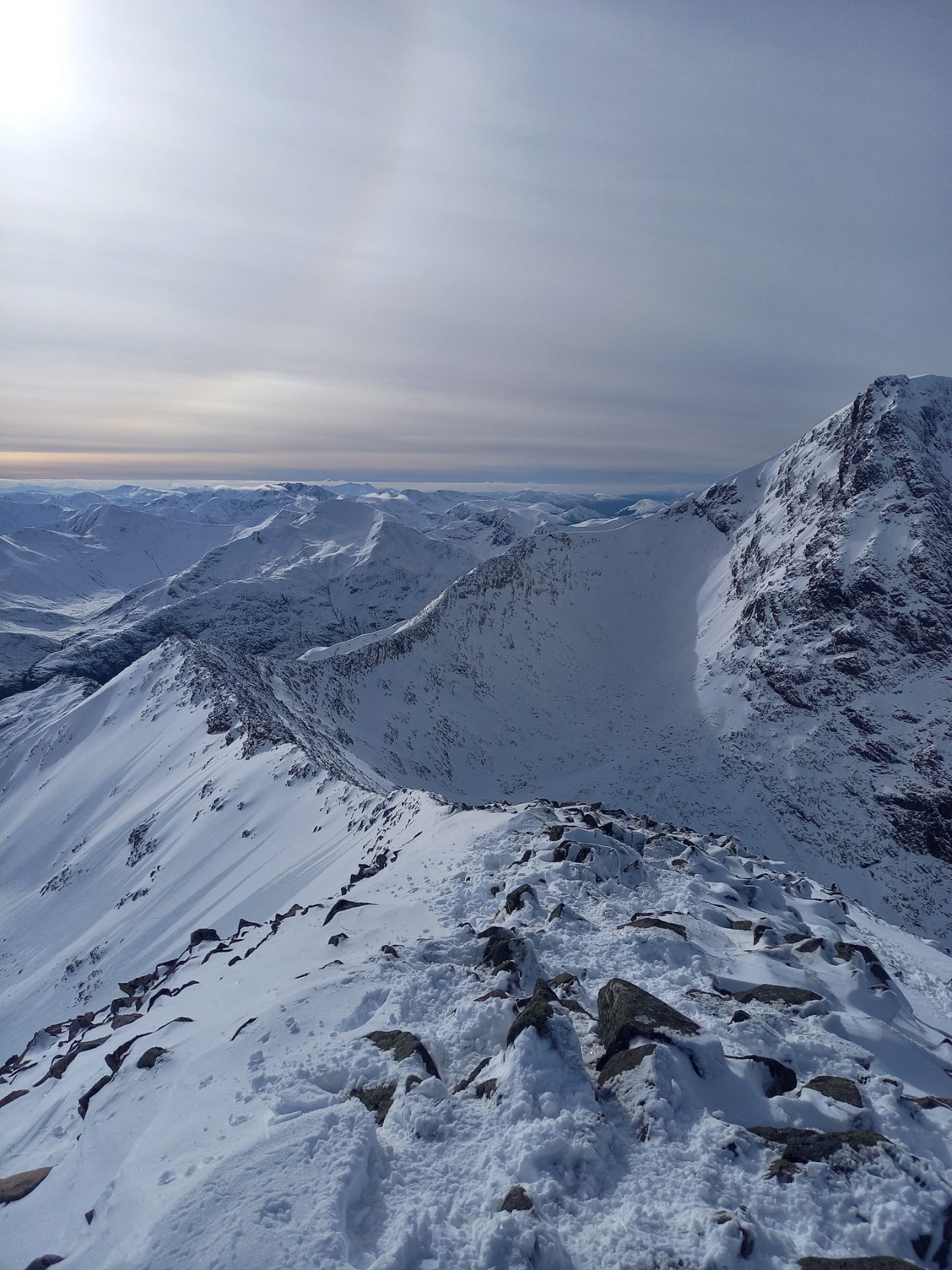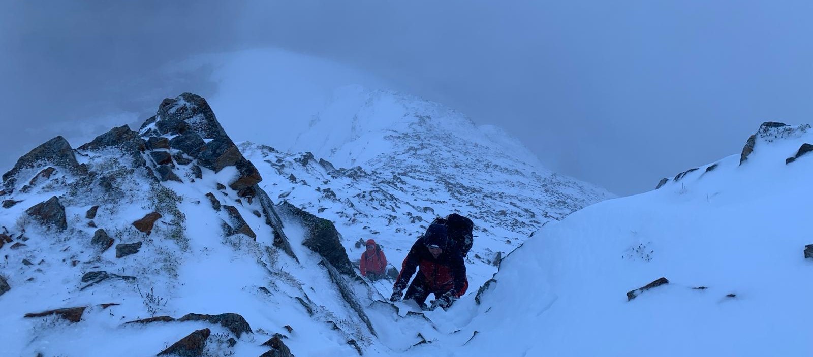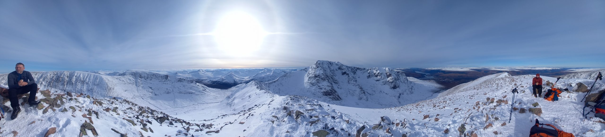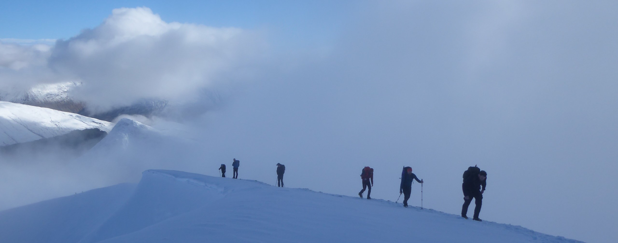 The Ring of Steall project did not go as it was hoped. Deep powder in places, poor visibility and the nature of the route all stacked up against the team. It was an ambitious plan that required enroute adjustment but even so it was a very long and tiring day where, for the second time, headtorches were needed in the descent. Perhaps the idea was over-optimistic but nontheless a fantastic effort was put in by all to keep the team together, keep moving and still be able to reflect positively on lessons learned. Maybe the fish and chip supper in Fort William helped because despite being hardly able to stand when back at the hut all were in remarkably good spirits.
