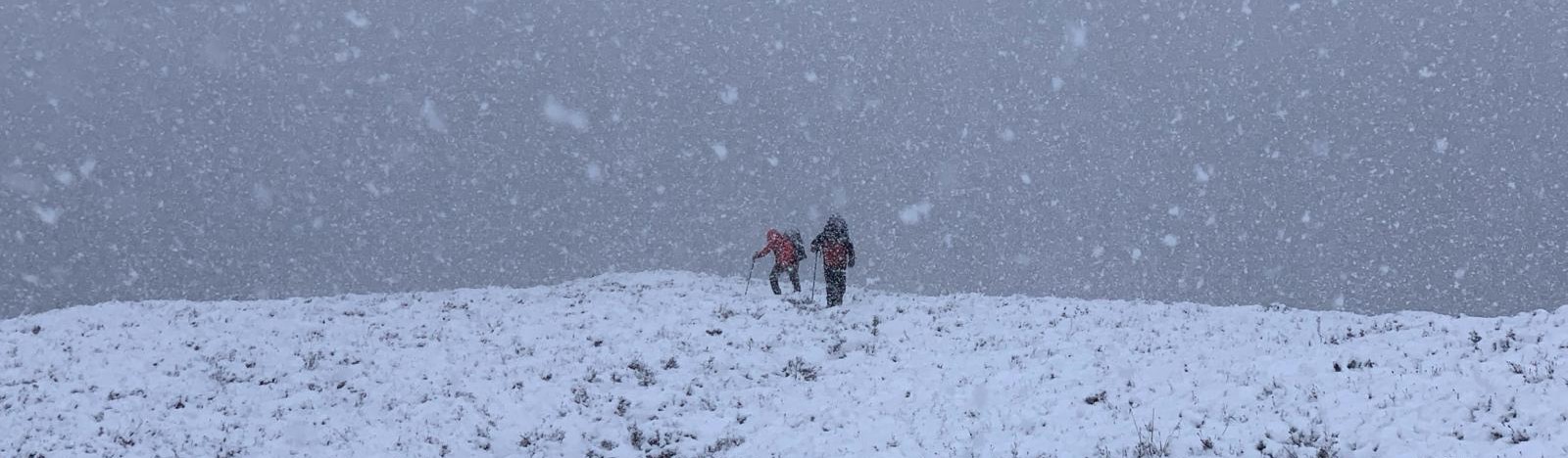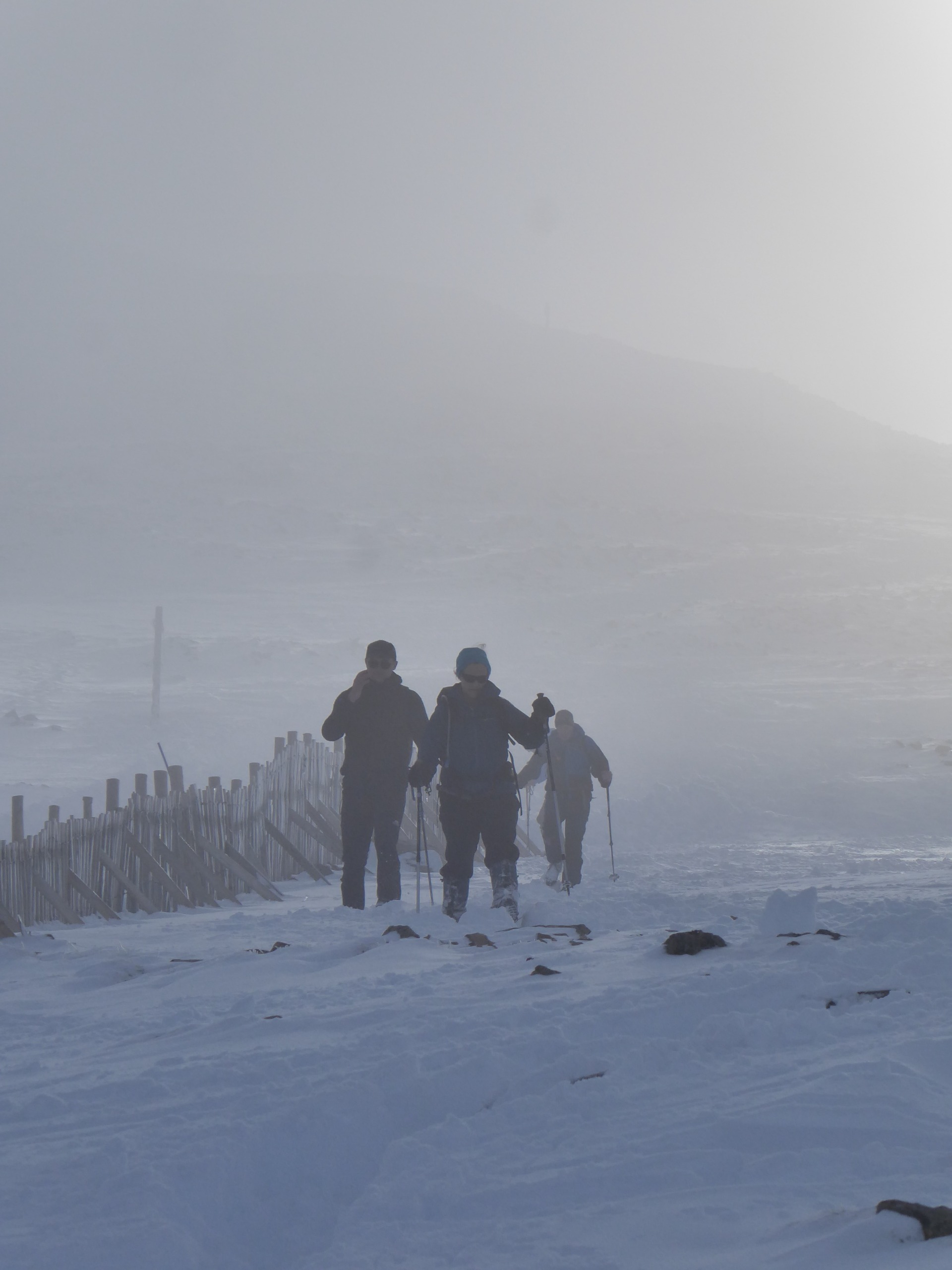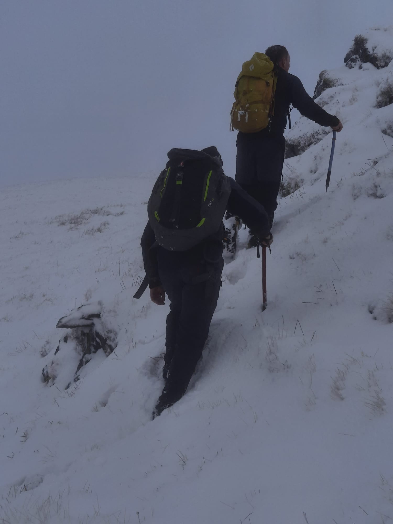 Six club members in two cars headed north on Thursday. An alpine type start saw them arrive in the Ballachulish area in the late morning and gave the opportunity for some prompt mountaineering action. The Chairman's weather dance was still working so rain, sleet, snow and wind were all evident and likely to remain all day and into Friday. Dave C, Derek W and Charley S headed up a nearby Corbett, Mam na Guilainn which gave Charley his first chance to try out the strange metallic, spiky outer footwear known as crampons. The Corbett was in good shape and was an ideal starter for the trip. Ed H, Ewart P and Carwyn E opted to take a look up Schoolhouse Ridge. The ridge, although in reasonable condition, required a big effort which took time and returning via the soft snow and heather to the north side of Beinn Bhan ridge resulted in the first head-torch assisted descent of the weekend.
