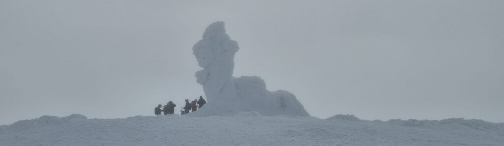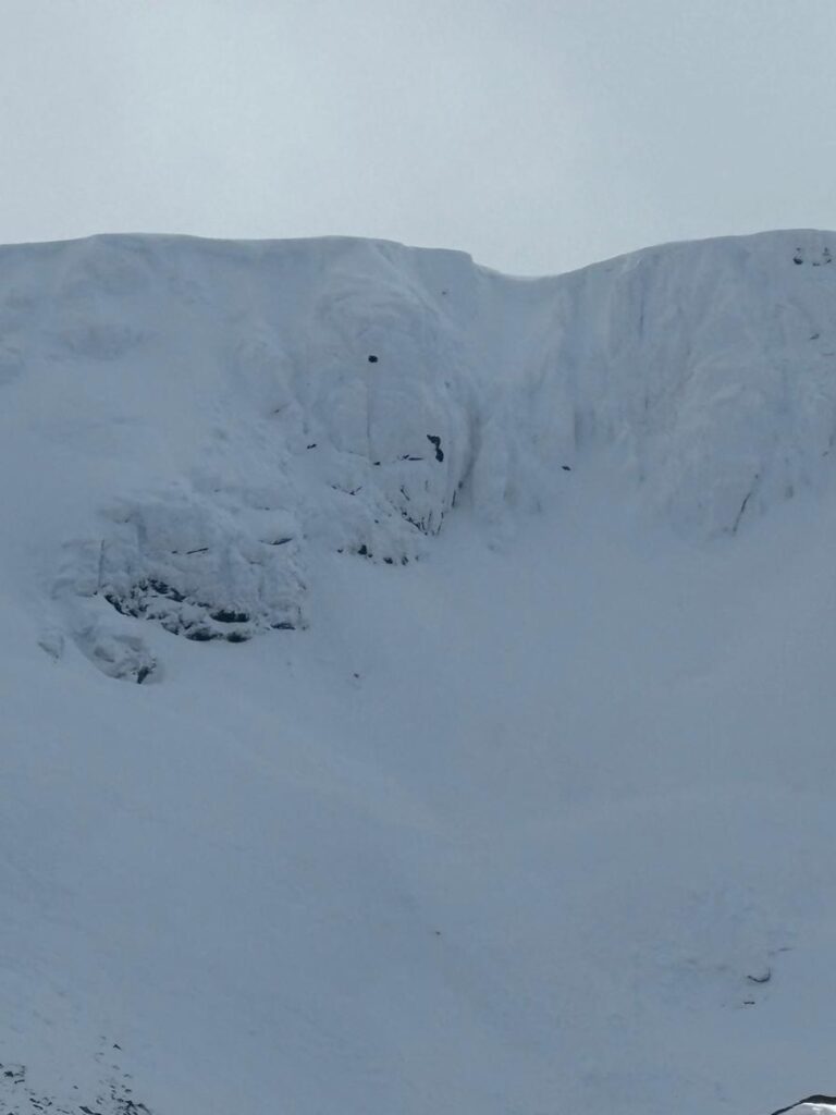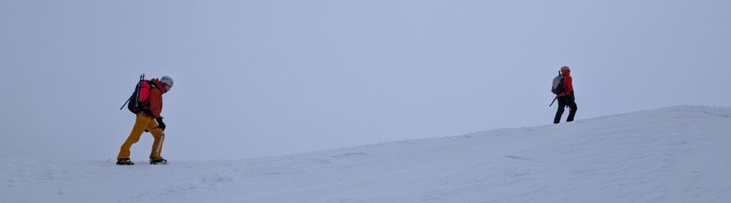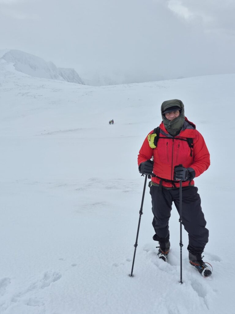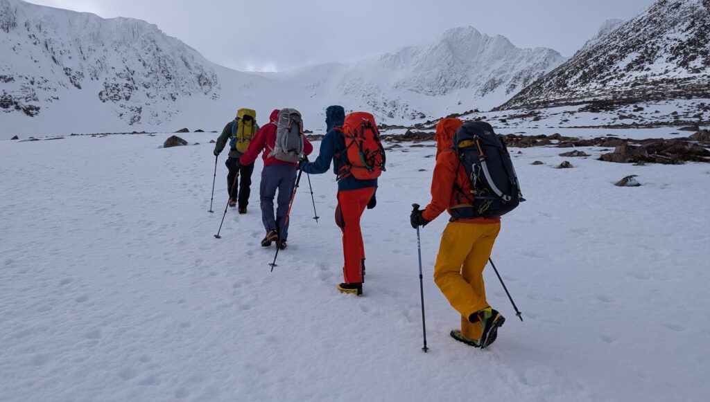The cloud had cleared for a while when the group were on Fiacaill Ridge but visibility dropped again during the traverse around the Coire towards point 1141. The walk round the rim gave further opportunity to see the difficulties of navigation and hazards such as the tops of huge cornices.