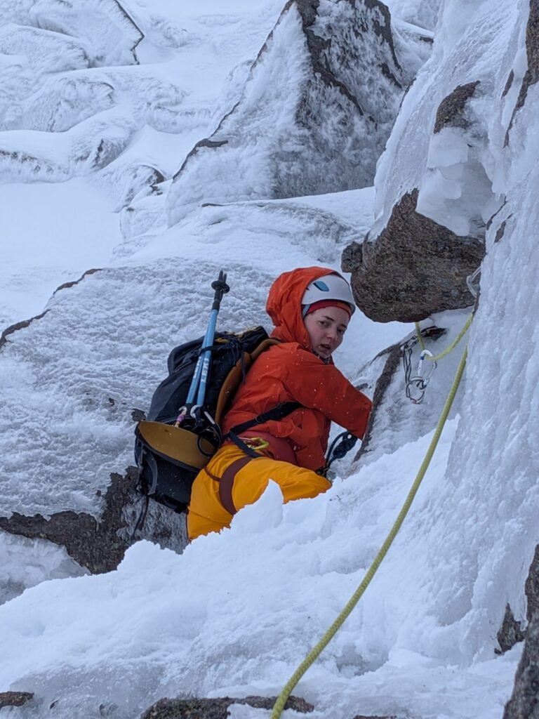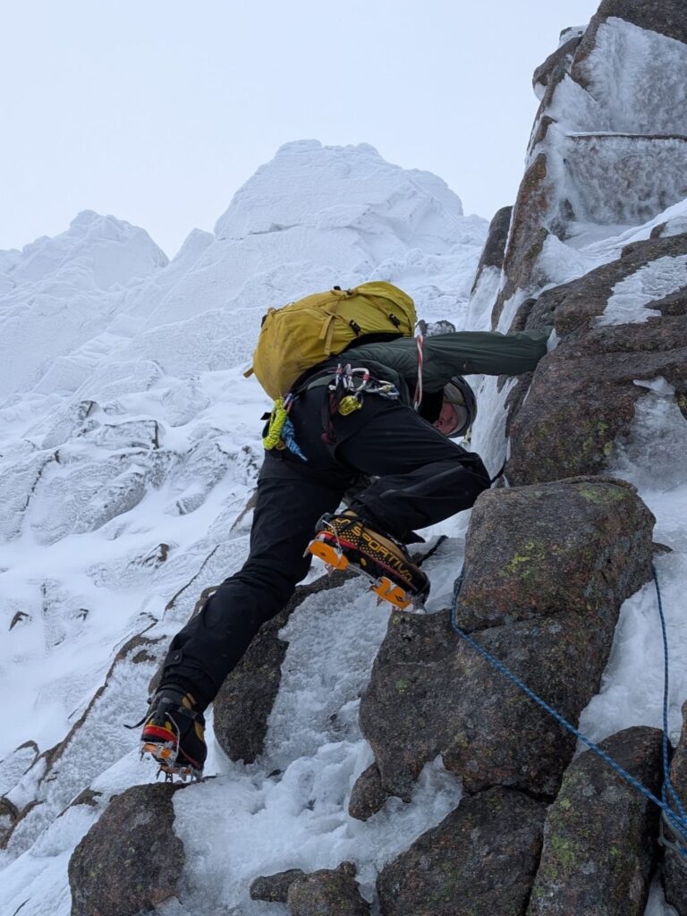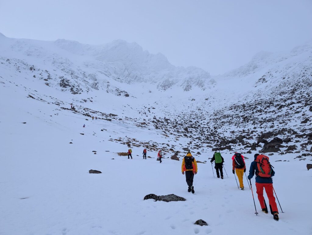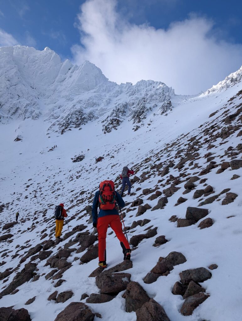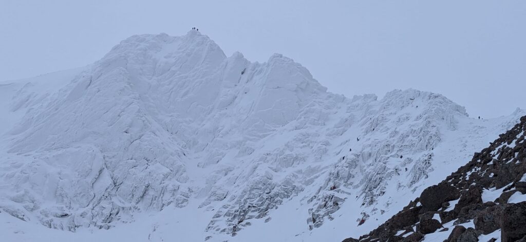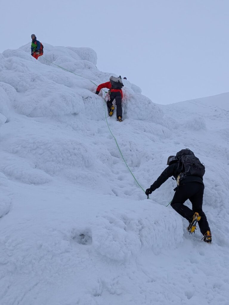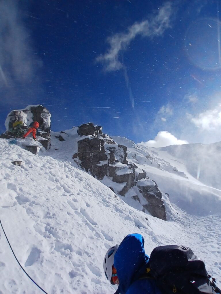 The weather conditions improved as the day went on so Fiacaill Ridge became an achievable aim. The group split into three roped teams for the upper parts of the ridge although the technical sections were largely avoided. Dave M was with Alex D and Rich B. Gav H with Tom G and Charley G. Phil H with Anabel C.