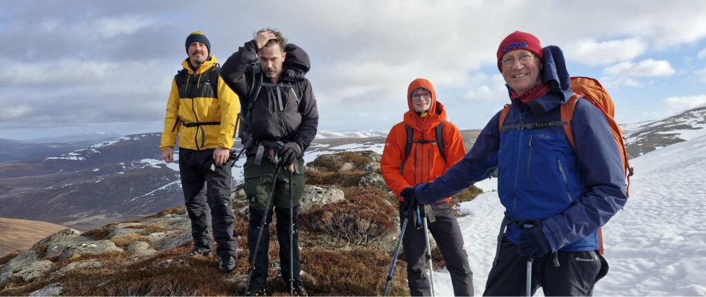 Brian and Tom were heading for home together on Sunday afternoon so hatched a plan for a walk up Sron a Cha-no which could continue up to Cairngorm summit if time allowed. Dave M, Charlie G and Rich joined them for the walk. Cairngorm summit was not achieved. Time went by too quickly and the westerly wind picked up, especially in showers so the route was shortened by traversing around the top of Coire Laogh Mor and descending Creagan Dubh.