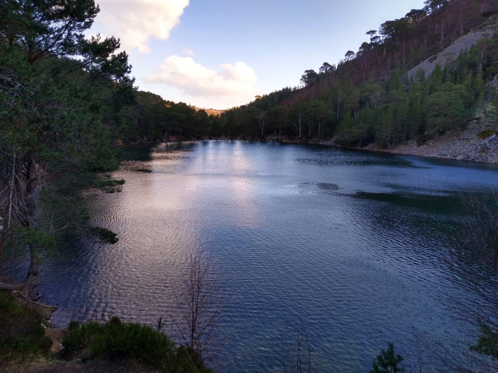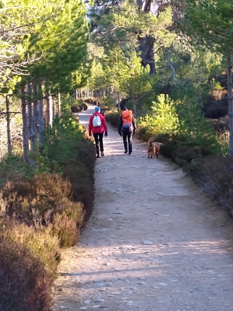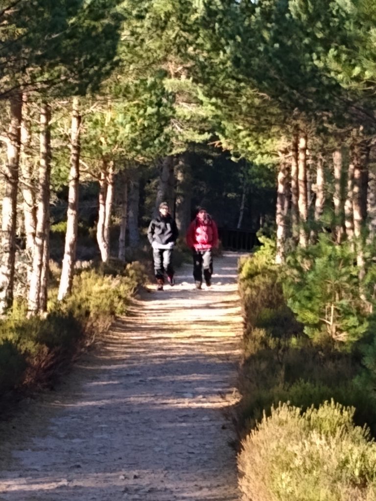 The route took us out of the forest into the ever more glorious sunshine up the hill to Ryvoan bothy where we enjoyed a lovely stop for a piece of flap jack and a cuppa before we cleared up the left behind rubbish, and headed along the undulating footpath back to Glenmore Lodge passing many Sunday morning walkers, bike riders and general outdoor enthusiasts, before the walk took us along the road back to the car park. A lovely Sunday morning 10 km route. A grand way to finish the winter weekend.